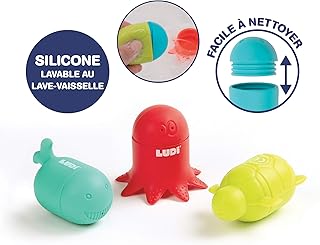 LUDI Baby Bad Spritzspielzeug Kombi Badespielzeug für Kleinkinder| 3 weiche Silikon Meerestiere für Badewanne, Dusche, phthalatfrei | Spülmaschinenfest und leicht zu trocknen | Ab 10 Monaten