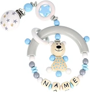 Premium Kinderwagen Anhänger mit Namen HOLZ Modell Teddybär Sterne grau hellblau