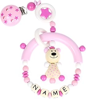 Premium Kinderwagen Anhänger mit Namen HOLZ Modell Teddybär Sterne pink