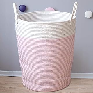 Aufbewahrungskorb aus Baumwollseil Wäschekorb gewebt Wäschekorb Haushalt Kinderzimmer Gewebte Kleidung Aufbewahrungstasche mit Griffen für Kinderzimmer Kinderzimmer Spielzeug Aufbewahrung L-white+pink